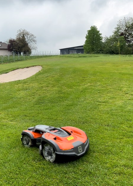 Emissionsfrei und leise, wartungsarm, bodenschonend – so werden in Cleebronn künftig Teile des Golfplatzes von GPS-gesteuerten Mährobotern gemäht.